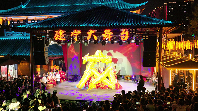 华灯初上,建宁文化市集的建宁大舞台现场已人山人海,热闹非凡,洋溢着欢腾的热闹气氛,锣鼓齐鸣,观众们沉浸其中。
